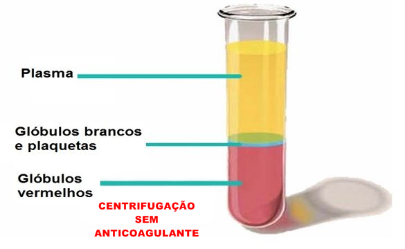 Este tubo de ensaio mostra, os elementos figurados do sangue, primeiro os glóbulos vermelhos, depois os brancos, estes são os elementos figurados do sangue. Depois a parte líquida o soro.