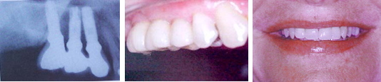 Estas fotografias mostram uma paciente que substituiu uma ponte móvel de extremo livre, no lado superior direito, por três implantes. Após a colocação das coroas, houve uma perfeita recuperação da função e da estética da paciente.