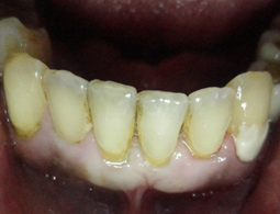 No hemiarco inferior vemos um quadro mais adiantado e grave. Há grande quantidade de cálculos supra e subgengival, a perda óssea é evidente pela retração do tecido, a gengiva marginal e inserida esta com todas características de uma inflamação, com perda óssea. Temos assim caracterizado uma PERIODONTITE INFLAMATÓRIA.