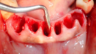 Os dentes depois de extraídos, os alvéolos limpos e curetados rigorosamente. Importantíssimo, netas cirurgias, é realizar os procedimentos como uma cirurgia de retalho periodontal, pois as paredes das bolsas periodontais devem ser totalmente removidas, com uma lâmina número 15, realizando uma incisão de bizel interno, para a remoção total do tecido interno que forma a bolsa, eliminando assim as bactérias infiltradas neste tecido. A exposição de uma mucosa gengival sadia, após o deslocamento do retalho total, é importantíssima, para a cicatrização. A camada basal do epitélio gengival, exposta, tem um enorme potencial de regeneração, o que será importante nas técnicas de Regeneração Óssea Guiada.