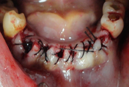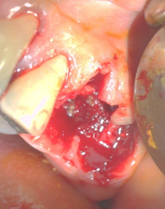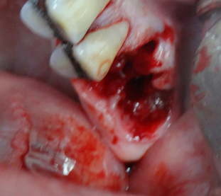 Depois de curetado os alvélos, foram preenchidos com material aloplástico: Gengimix + Adesivo cirúrgico. Para manutenção do material enxertado a ferida cirúrgica foi recoberta com uma membrana de colágeno reabisorvível. Neste procedimento é importante o material ser bem comprimido e protegido, não haverá sangramento após a intervenção. p22p21Importante notar que as raízes do primeiro molar foram seccionadas, para a nutenção do alvéolo remanescente, o segundo molar não houve necessidade deste procedimento. Depois de colocada a membrana tudo foi muito bem suturado, e colocado cimento cirúrgico. p23p24Estas são as duas radiografias a primeira, logo após a cirurgia e curetagem dos alvélos, (ela está invertida, para comparação). A segundo é após o preenchimento dos alvélos com material de ROG.