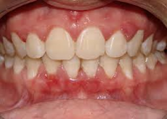 Nesta fotofgrafia vemos ma gengiva normal. A cor é rosa pálida, a textura é semelhante a uma casca de laranja em miniatura, as papilas são finas ocupando o espaço interdentário, terminam bem delgadas na superfície do esmalte. Não sangram na escovação.