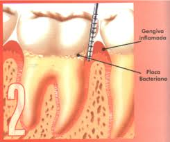 Este esquema mostra uma sonda milimetrada inserida no sulco gengival, medindo o aprofundamento do sulco, que no caso se chama de bolsa periodontal. Mostra também o biofilme, causador do processo inflamatório, se não for removido causará perda óssea, e consequentemento no futuro a perda do dente.
